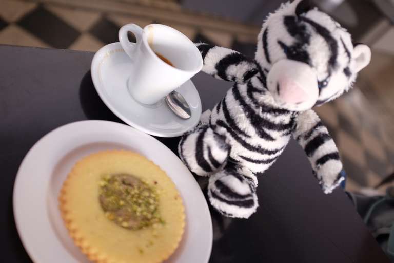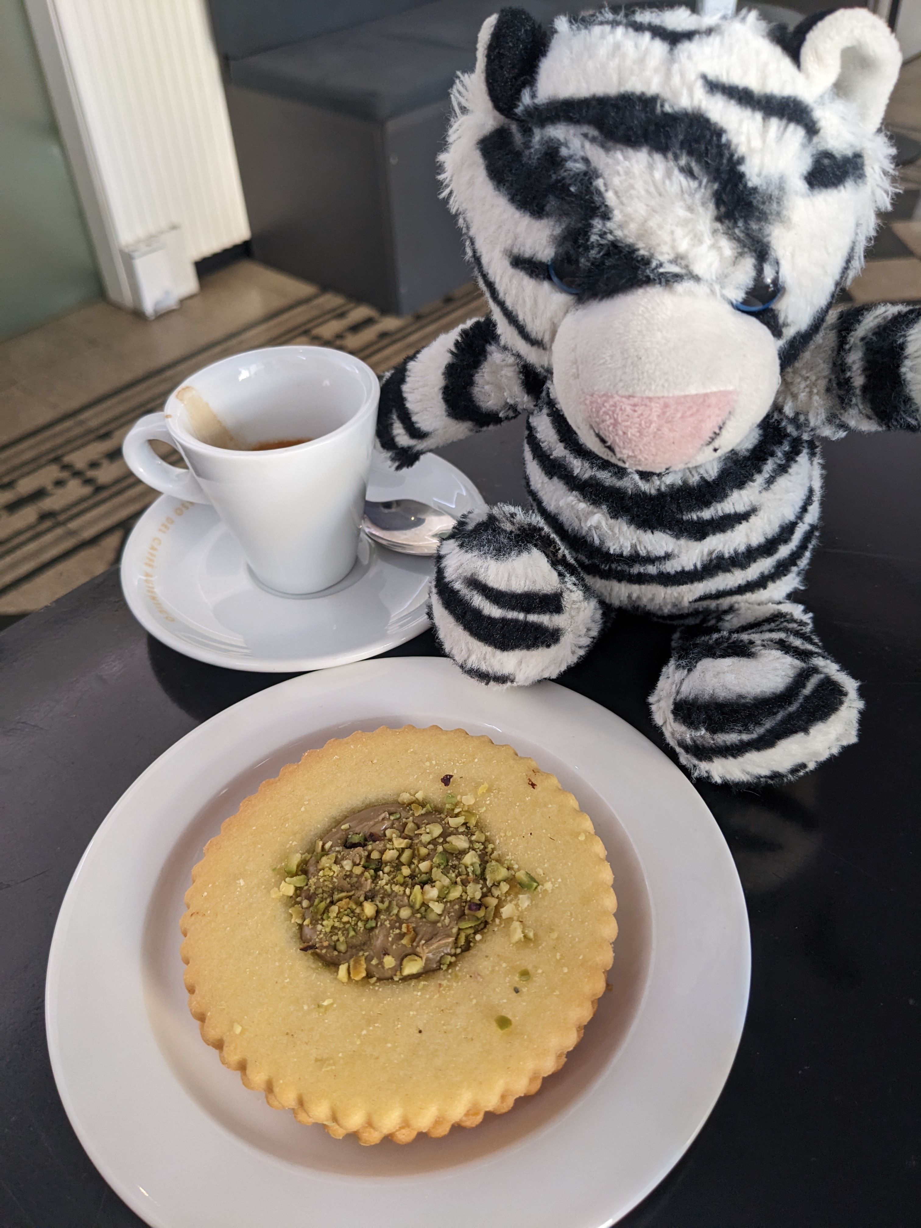 Die anderen trinken hier irgendwie ganz viel Kaffee... Der scheint wohl besonders gut zu sein. Aber der ist wohl so stark, dass ich nicht mehr schlafen würde wenn ich davon etwas trinken würde. Deswegen habe ich einen Keks mit Pistaziencreme bekommen.